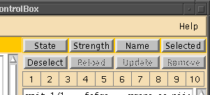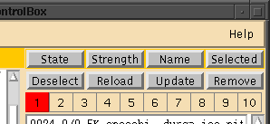 使い方は、まずチャット中にリスト中の記憶させたいユーザを選択し(複数可)、次にコントロール・ボックスの右上にならんでいる背景色の[1]〜[10]ボタンの一つを押します (画像)。すると、押したボタンが赤色に変化します(画像)。これでそのボタンには選択したユーザが記憶されたことになります(これを「グループ化」と呼びます)。チャット中にこのボタンを押せば、瞬時に記憶したグループを選択することができます。